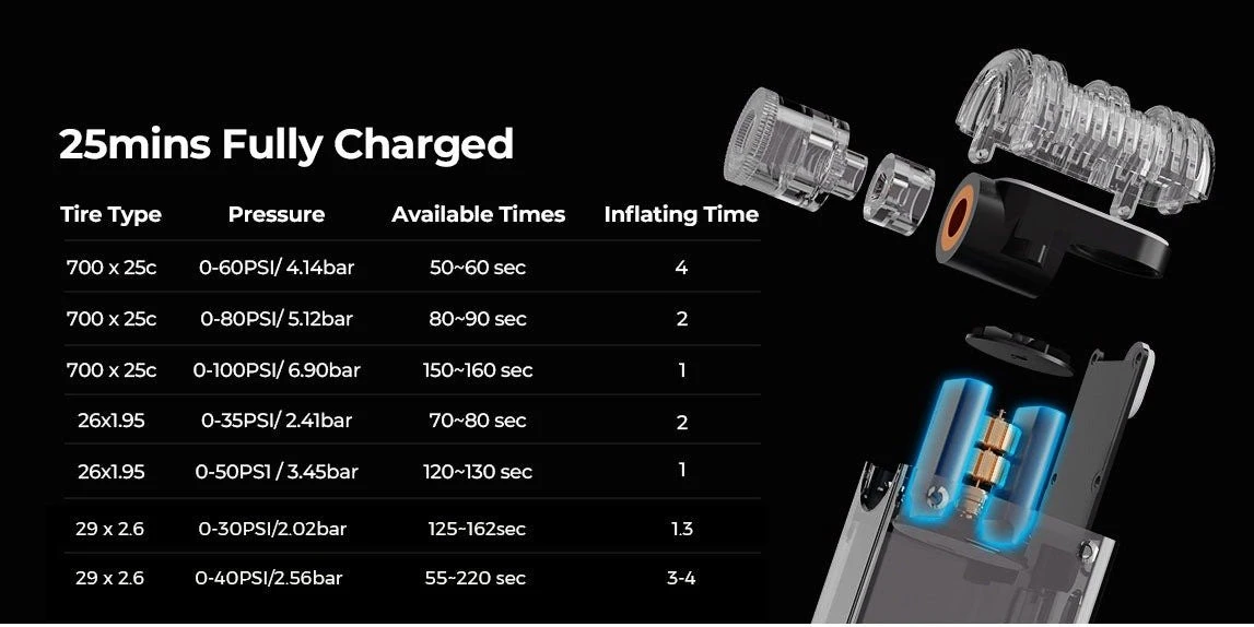 Dans les faits, il faut 25 minutes pour la recharger intégralement sur secteur. Un indicateur de charge (bouton vert) permet de savoir lorsque la batterie est totalement pleine. Avec une recharge, vous pourrez gonfler 2 pneus de dimensions 700 x 25C jusqu’à 80 PSI. Cet outil peut gonfler un pneu à 80 PSI en 80 secondes. La pression maximale de cette pompe est de 100 PSI (Equivalent 6.90 Bar).