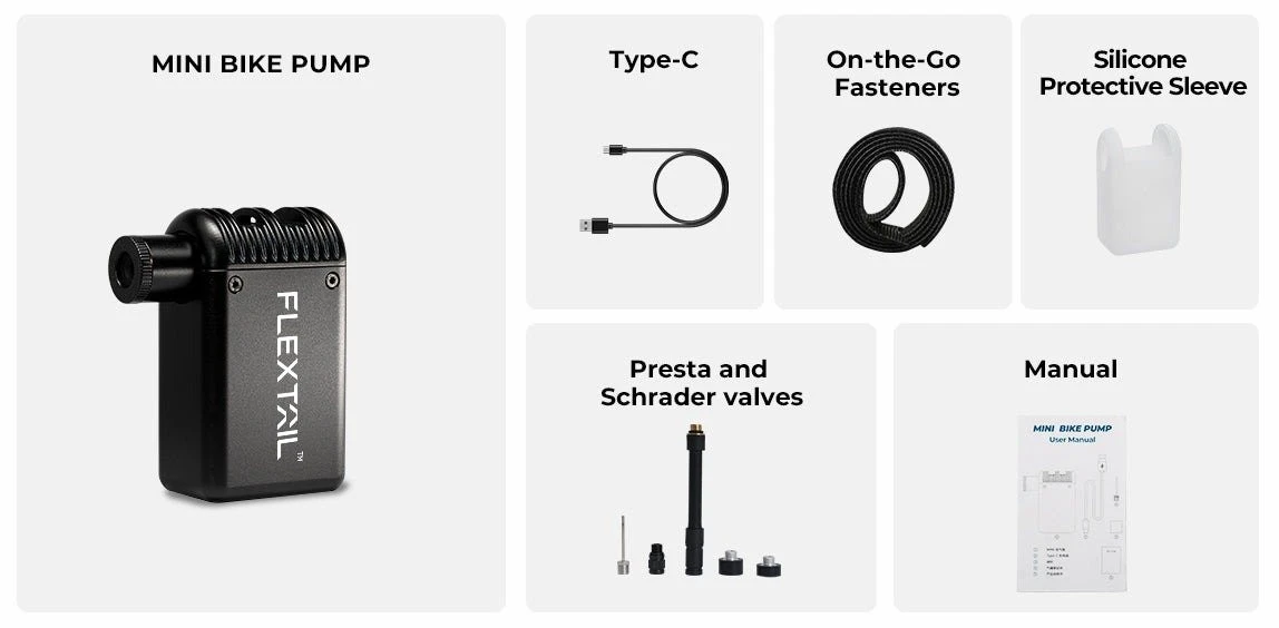 La Tiny Bike Pump de Flextail est une pompe de vélo électrique, ultralégère et ultracompacte. Ce mini compresseur rechargeable pèse seulement 100 grammes. Cette pompe fabriquée en aluminium est dotée d’une batterie d’une capacité de 350mAh et d’un port de recharge en USB-C.